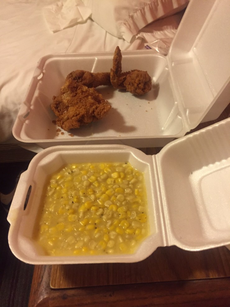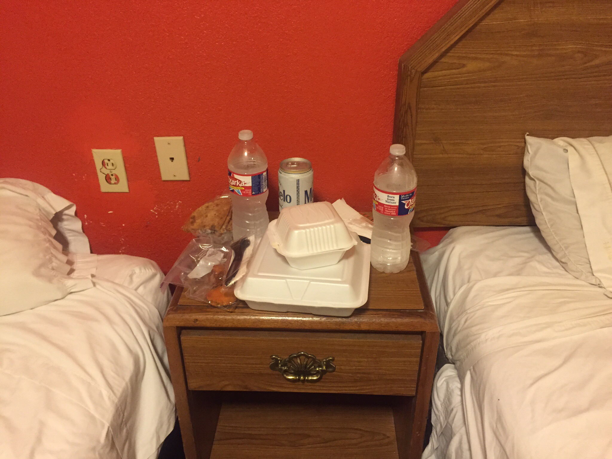 I just washed my hair with bar soap that I’m pretty sure was made out of plastic. I literally showered with my eyes closed to avoid seeing the mold above my head. My dad’s bed lacks a headboard. The fire alarm is broken. And I’m pretty sure this bedspread has never seen a washing machine. Our dinner was a 4-piece chicken for $4.44 and something that appears to be corn from the hotel office/pizza shop/lotto shop/phone card seller/general hangout.