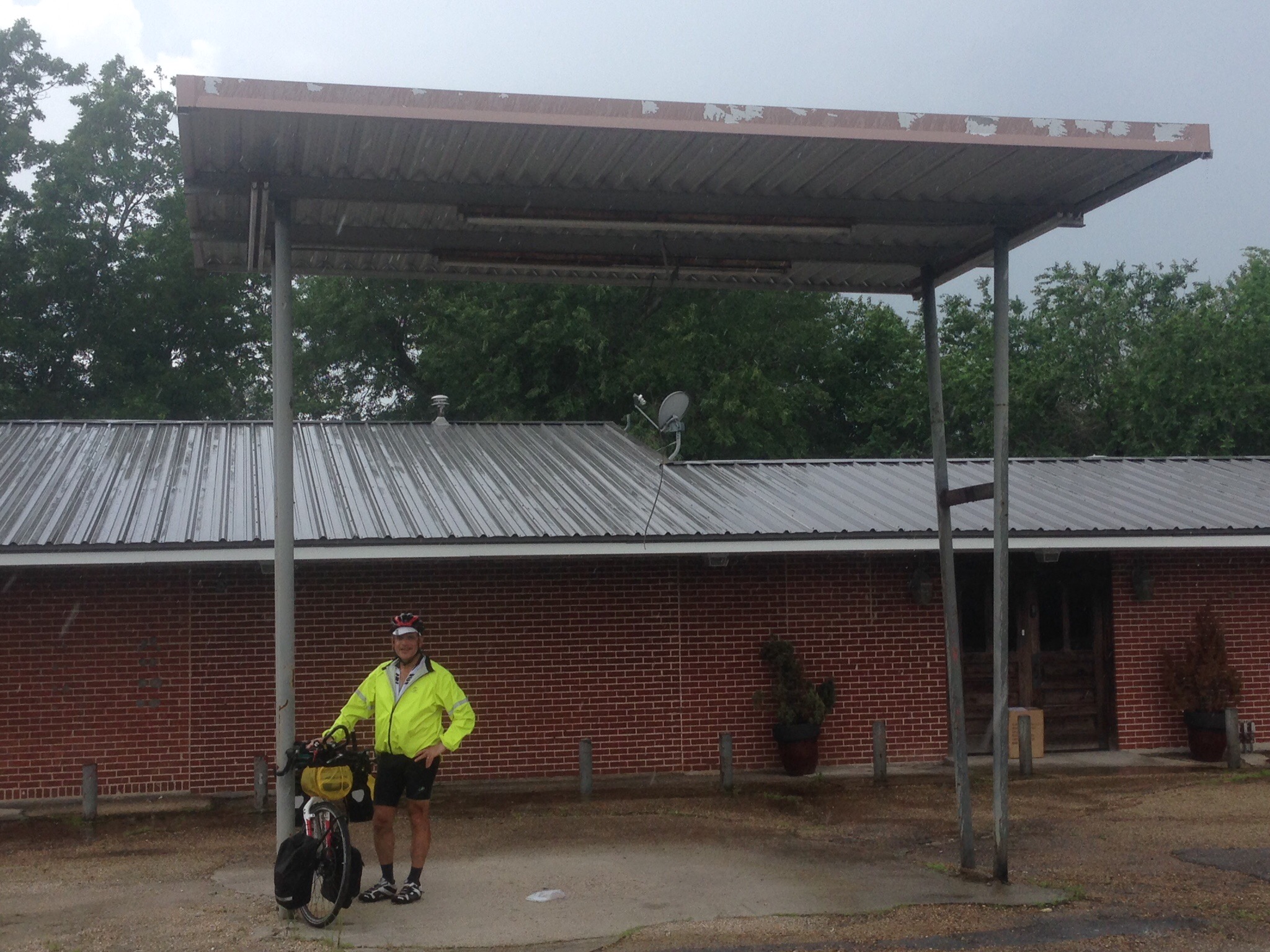 As a matter of fact that is our family motto, “to end of the world.” Jessica and I have been there several times on this journey. Today we ate Cliff Bars for breakfast and escaped from our moldy “sportsman’s motel” early, pedaling to New Roads on beautiful LA 1. After lunch on the river we started south but had to stop several times for thunderstorms.